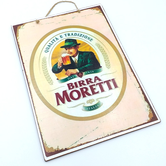 Vintage χειροποίητο πινακάκι Birra Moretti, εσωτερικού χώρου από mdf ξύλο με τεχνοτροπία παλαίωσης. Καλυμμένη από οικολογικό βερνίκι για μακροχρόνια διατήρηση, για την αφαίρεση της σκόνης χρησιμοποιείτε μόνο στεγνό πανί.
