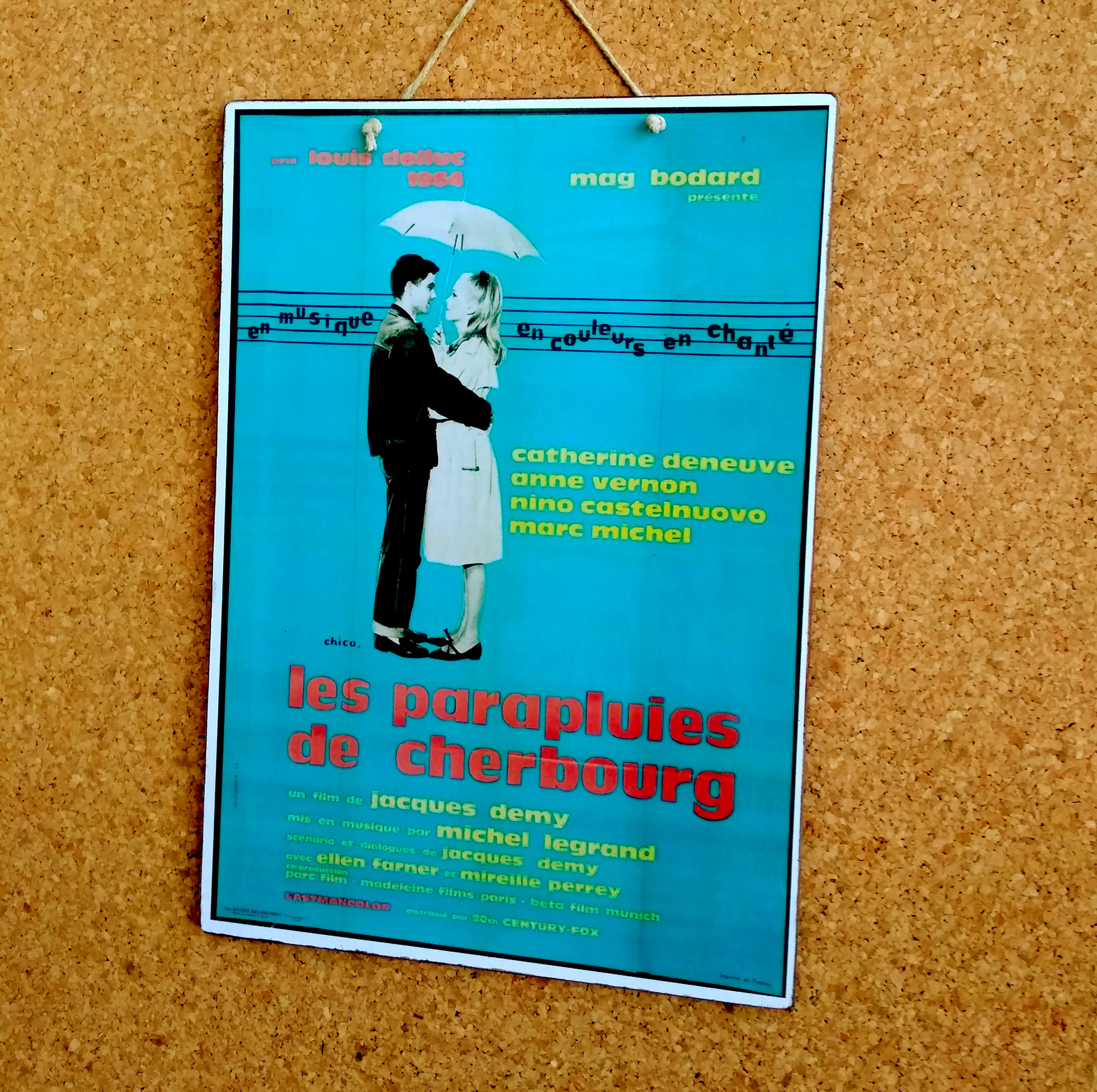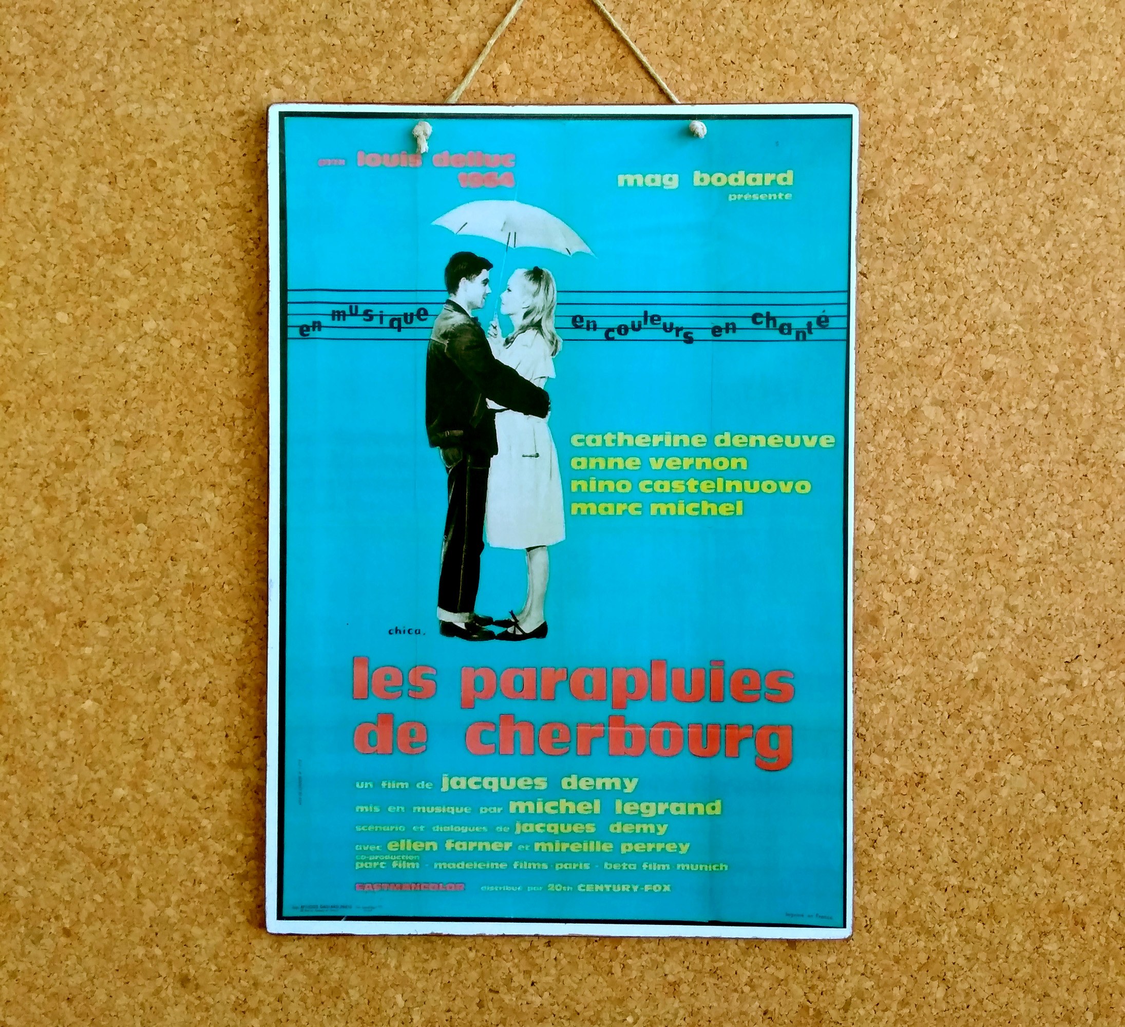 Vintage χειροποίητη κινηματογραφική αφίσα Les Parapluies De Cherburg (Οι Ομπρέλες Του Χερβούργου) του 1964, εσωτερικού χώρου από mdf ξύλο με τεχνοτροπία παλαίωσης. Καλυμμένη από οικολογικό βερνίκι για μακροχρόνια διατήρηση, για την αφαίρεση της σκόνης χρησιμοποιείτε μόνο στεγνό πανί.