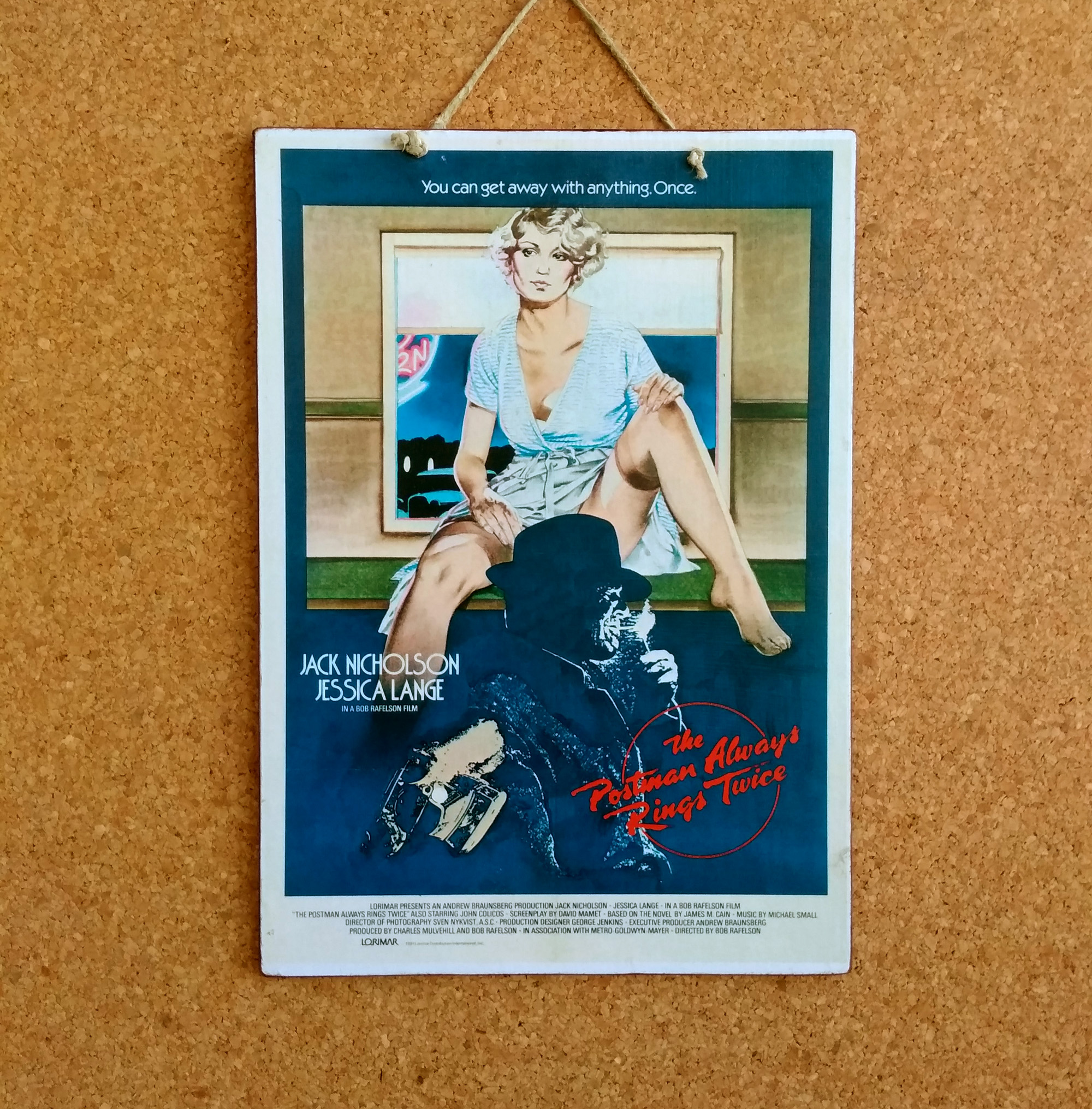 Vintage χειροποίητη κινηματογραφική αφίσα The Postman Always Rings Twice (Ο Ταχυδρόμος Χτυπάει Πάντα Δύο Φορές) του 1981, εσωτερικού χώρου από mdf ξύλο με τεχνοτροπία παλαίωσης. Καλυμμένη από οικολογικό βερνίκι για μακροχρόνια διατήρηση, για την αφαίρεση της σκόνης χρησιμοποιείτε μόνο στεγνό πανί.