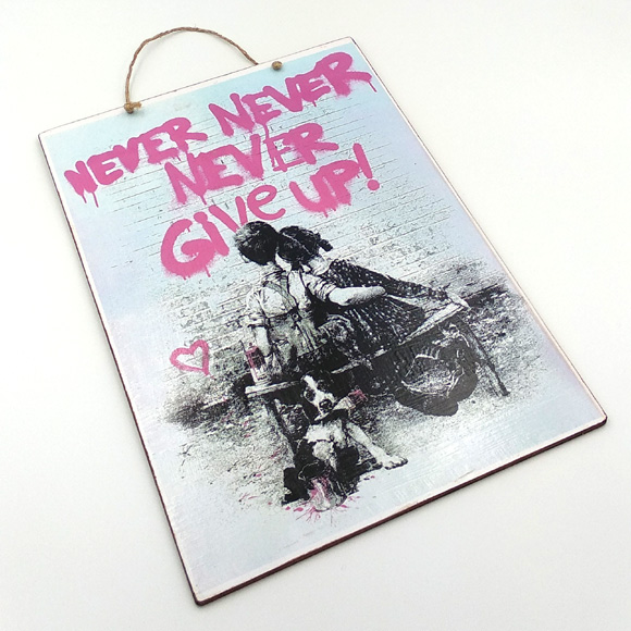 Vintage χειροποίητη πινακίδα αφίσα Never NeverbNever Give Up!, εσωτερικού χώρου από mdf ξύλο με τεχνοτροπία παλαίωσης. Καλυμμένη από οικολογικό βερνίκι για μακροχρόνια διατήρηση, για την αφαίρεση της σκόνης χρησιμοποιείτε μόνο στεγνό πανί.