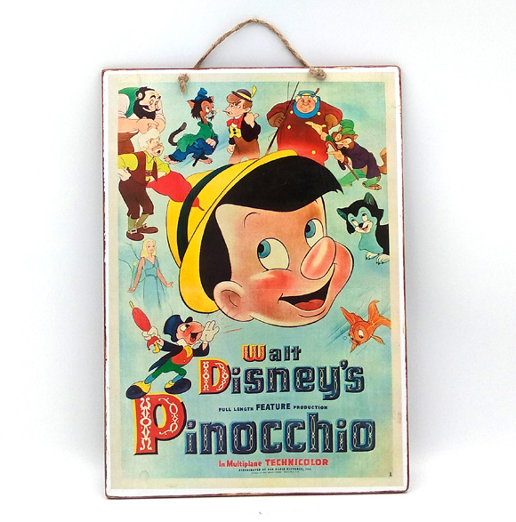 Vintage χειροποίητη κινηματογραφική αφίσα Pinocchio (Πινόκιο) του 1962, εσωτερικού χώρου από mdf ξύλο με τεχνοτροπία παλαίωσης. Καλυμμένη από οικολογικό βερνίκι για μακροχρόνια διατήρηση, για την αφαίρεση της σκόνης χρησιμοποιείτε μόνο στεγνό πανί.