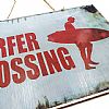 Vintage χειροποίητη πινακίδα με σερφινγκ Surfer Crossing εσωτερικού χώρου από mdf ξύλο με τεχνοτροπία παλαίωσης. Καλυμμένη από οικολογικό βερνίκι για μακροχρόνια διατήρηση, για την αφαίρεση της σκόνης χρησιμοποιείτε μόνο στεγνό πανί.