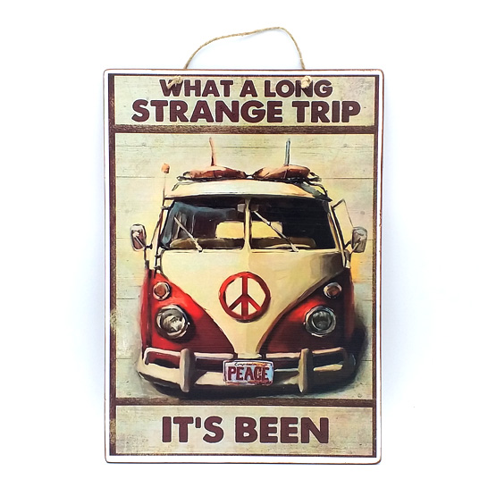 Vintage χειροποίητη πινακίδα με σερφινγκ VW Campervan What A Long Strange Trip It's Been εσωτερικού χώρου από mdf ξύλο με τεχνοτροπία παλαίωσης. Καλυμμένη από οικολογικό βερνίκι για μακροχρόνια διατήρηση, για την αφαίρεση της σκόνης χρησιμοποιείτε μόνο στεγνό πανί.